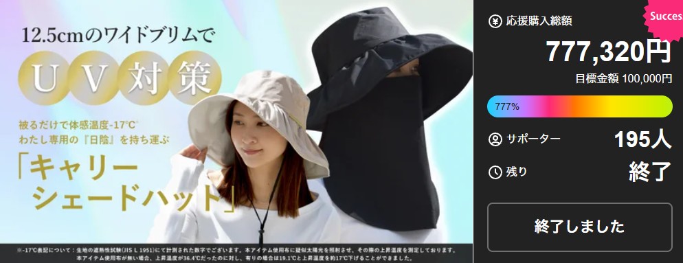 Makuake(マクアケ)で、2025年5月に開催したプロジェクトでは、777%の達成率で195名の方に応援購入いただきました!夏の日差し、外出時の強い紫外線…そんな中で、全面日傘生地のツバ広ハットは多くの方に喜んでいただきました。